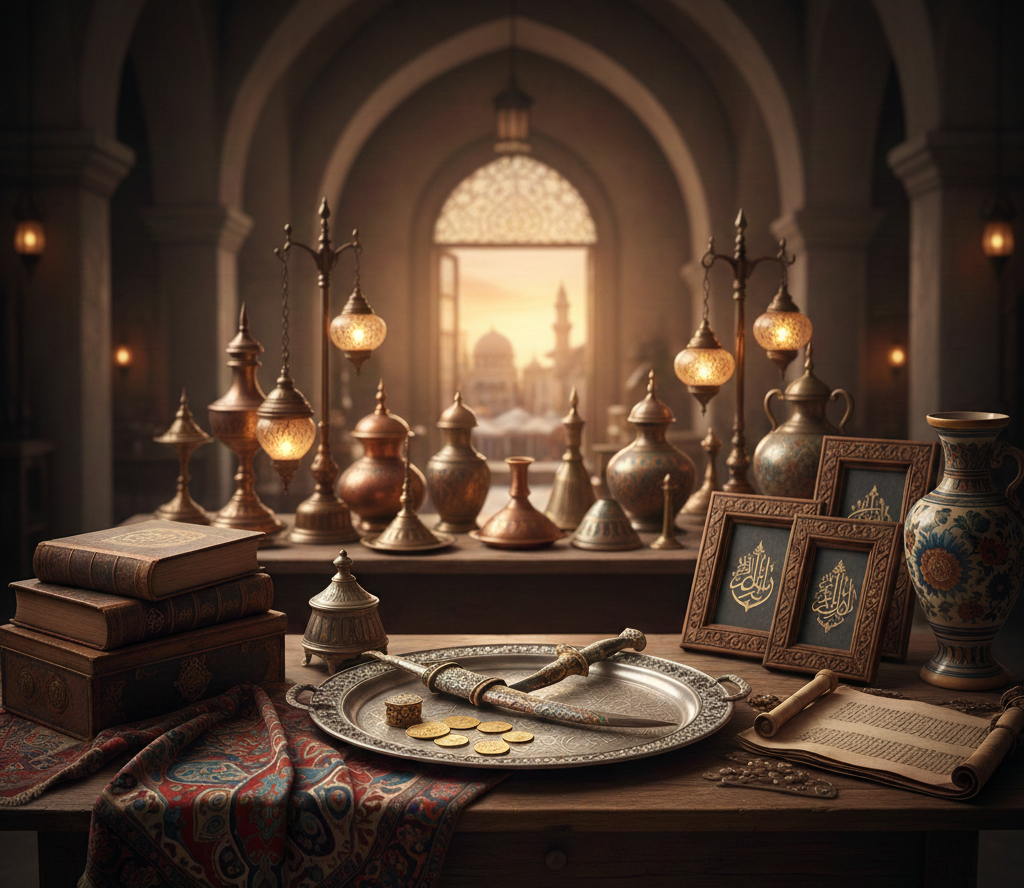 Tughra-Silberwaren, Iznik-Keramik, Koranmanuskripte, historische Waffen (Deko).